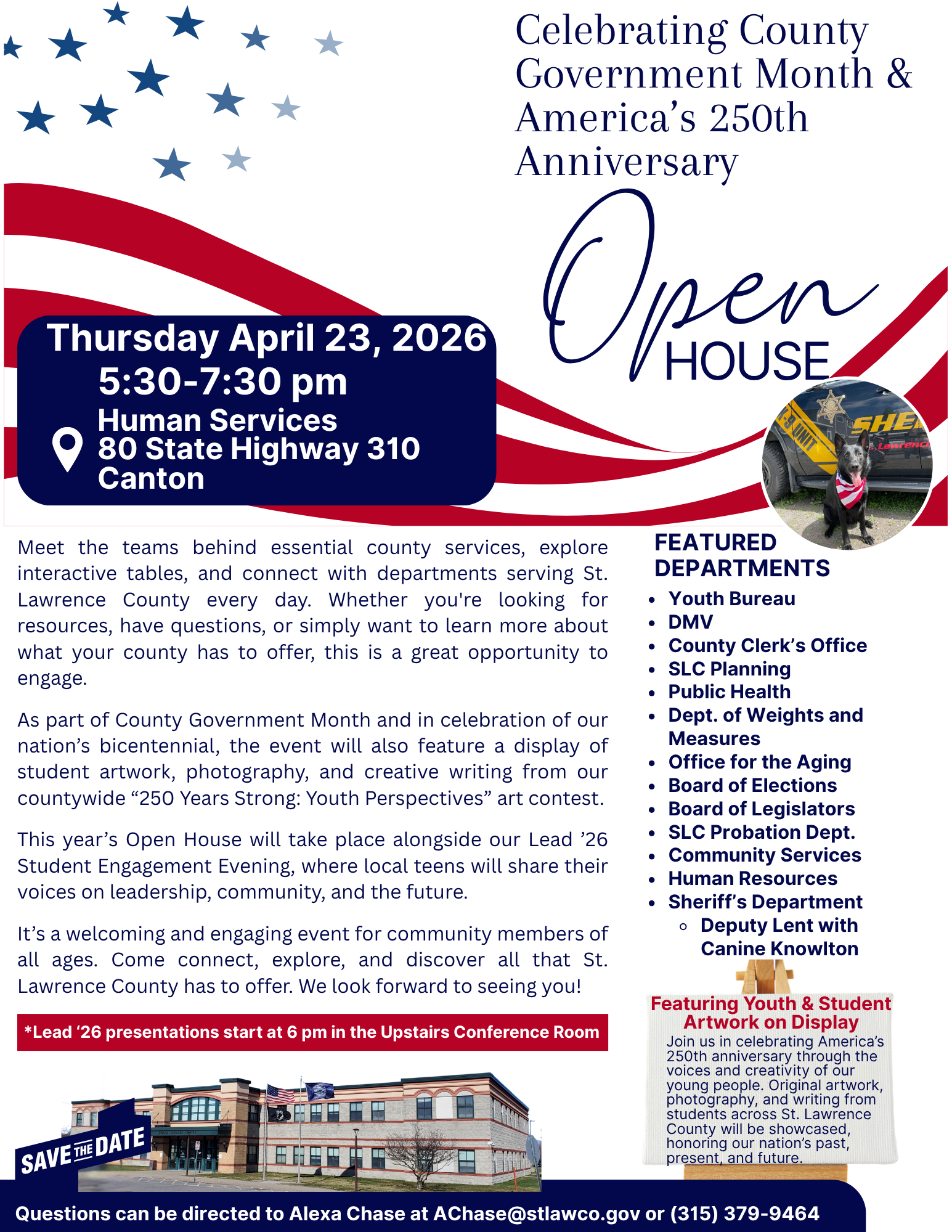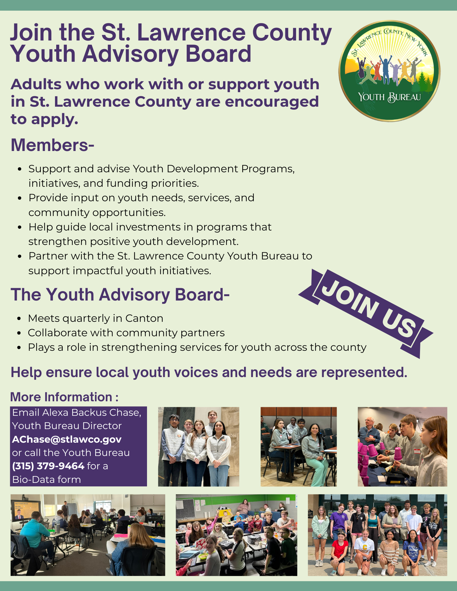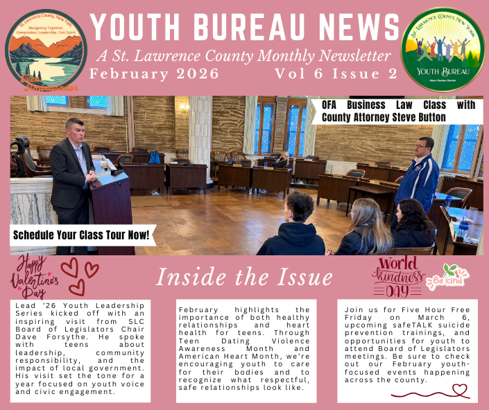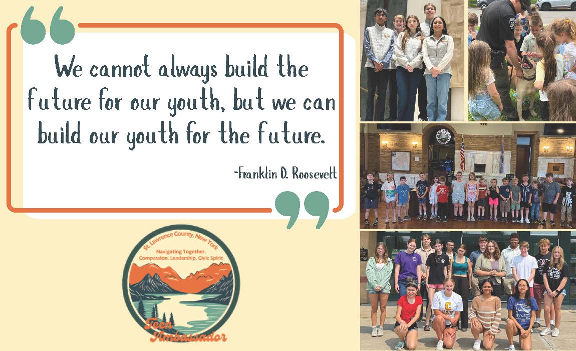 Since 1945 the State Youth Commission of New York has been providing technical and financial support to youth programs in communities throughout the state. The intent was to provide services for the personal development of youth and to prevent, detect and treat delinquency. Over the years this program evolved into the St. Lawrence County Youth Bureau which has been a County Department since 1978. Today the mission of the St. Lawrence County Youth Bureau is very similar to what it was in 1945 with the goal of ensuring that children, adolescents, and young adults have access to programs that will help them to be contributing members of society. This department is dedicated to preventing delinquency through positive youth development and the implementation of comprehensive youth services to all youth in St. Lawrence County.
