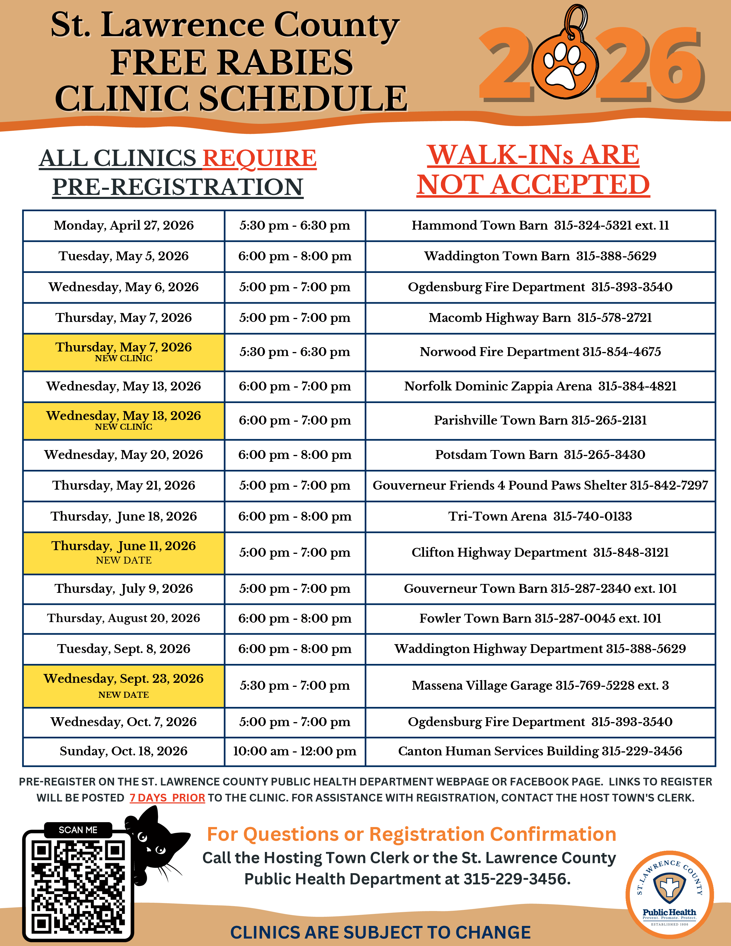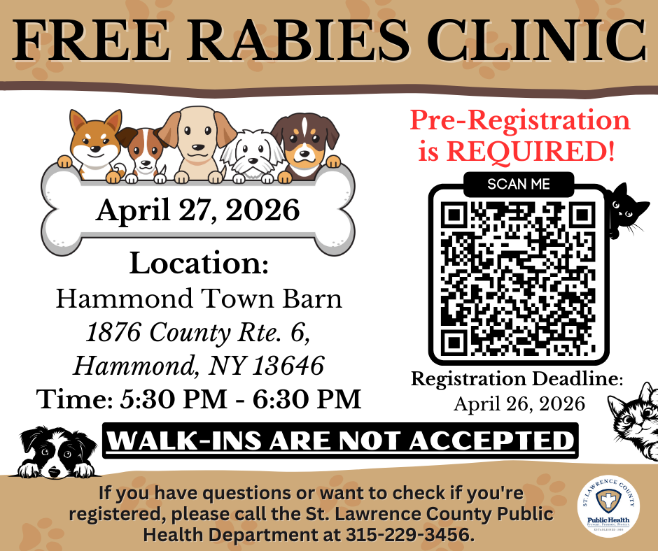 Hammond’s Free Rabies Clinic registration is now open. All clinics REQUIRE pre-registration; there will be NO WALK-INs. Please arrive at your scheduled time to prevent congestion. Animals must have a collar and leash, and cats must be in an animal carrier or a pillowcase. All animals must be under the control of an adult.- To register your pet, please scan the QR code or follow this link: https://apps2.health.ny.gov/doh2/applinks/cdmspr/2/counties?OpID=49DBDE185740CA3AE0631403580A89BF