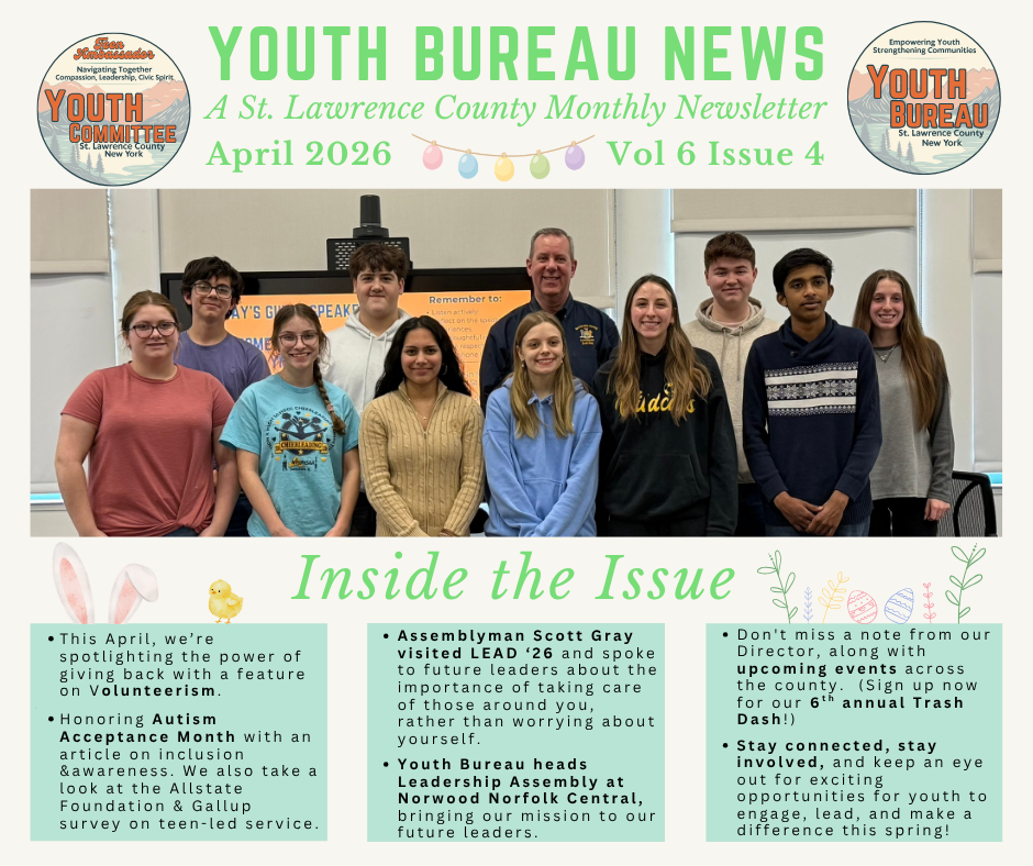 Since 1945 the State Youth Commission of New York has been providing technical and financial support to youth programs in communities throughout the state. The intent was to provide services for the personal development of youth and to prevent, detect and treat delinquency. Over the years this program evolved into the St. Lawrence County Youth Bureau which has been a County Department since 1978. Today the mission of the St. Lawrence County Youth Bureau is very similar to what it was in 1945 with the goal of ensuring that children, adolescents, and young adults have access to programs that will help them to be contributing members of society. This department is dedicated to preventing delinquency through positive youth development and the implementation of comprehensive youth services to all youth in St. Lawrence County.